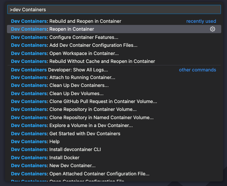Then from the command pallette (cmd+shift+p on Mac) chose to “Reopen in Container”.